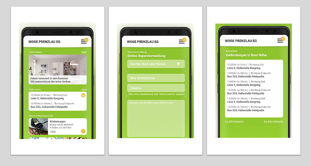 Die neue Anwendung zeigt Unternehmensnews und Termine an. Auch Schadensmeldungen an das Unternehmen sind über die App sowie das Onlineportal schnell und einfach möglich. Im Forum können die Mieterinnen und Mieter miteinander ins Gespräch kommen. Auf dem Mietermarktplatz werden Gesuche und Angebote eingestellt. Monatliche Verbrauchsinformationen werden gesetzeskonform pro Haushalt angezeigt. Hierfür werden je nach Anbieter die passenden Schnittstellen programmiert. Im Dokumentencenter finden die Mieterinnen und Mieter ihren Mietvertrag, Hausordnungen, Anträge und andere wichtige Informationen. Außerdem kann die App je nach Standort Echtzeitdaten der öffentlichen Verkehrsbetriebe anzeigen.